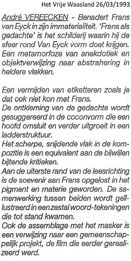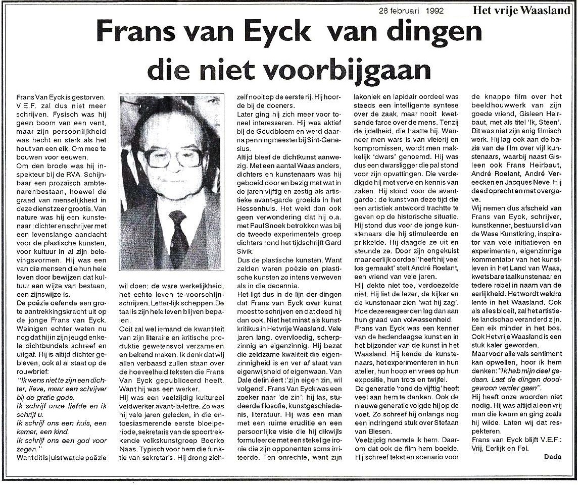 Donc les arts plastiques. Car rarement la poésie et les arts plastiques ont été aussi intensément imbriqués que durant ces décennies. C'est donc dans la ligne des choses que Frans van Eyck voulait écrire sur l'art et il l'a fait. Notamment en tant que critique d'art dans "Het Vrije Waasland". Pendant de nombreuses années, de manière abondante, perspicace et volontaire. Il possédait cette qualité rare de têtu et loin de l'entêtement ou de l'orgueil. Van Dale définit "suivre sa propre volonté". Frans van Eyck était un chercheur de "sens" : il a lu, étudié la philosophie, l'histoire de l'art, la littérature. C'était un homme d'une grande érudition et d'une vision personnelle qu'il formulait souvent avec une ironie piquante qui irritait parfois ses adversaires. À tort, car son jugement laconique et lapidaire a toujours été une synthèse intelligente de la matière, mais jamais blessante et méchante sur l'homme. Sauf la vanité, qu'il détestait. Lorsque l'on est opposé à la flatterie et aux compromis, on est facilement appelé "obstructeur". C'était donc un obstructionniste qui défendait ses opinions.